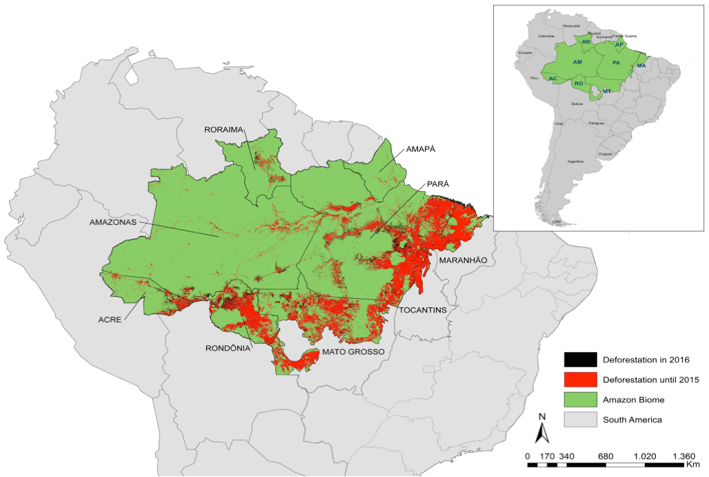 No Brasil, o desmatamento da Amazônia é comparado com um dragão faminto, e esse dragão estava sob controle no passado. O desmatamento na região caiu 70% entre 2005 (19.014 km2) e 2014 (5.012 km2) em resposta a estratégias diferentes. Mas o monstro não foi morto; ele estava apenas tirando um cochilo. Desde 2012, a taxa anual de desmatamento ficou em torno de 5 mil km2; (4.571 km2 em 2012, 5.891 km2 em 2013, 5.012 km2 em 2014 e 6.207 km2 em 2015), de acordo com dados do Prodes. Infelizmente, em 2016 o dragão adormecido acordou. Em 29 de novembro, o governo brasileiro divulgou dados do desmatamento em 2016 mostrando que uma área equivalente a dez vezes a cidade de Nova York (7.989 km2) foi destruída (figura 1). Essa é a maior taxa registrada desde 2008, quando o desmatamento foi de 12.911 km2, possivelmente indicando o retorno de um antigo padrão de desmatamento.