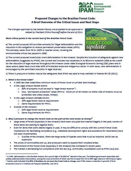 Documento apresenta contribuições para o Relatório da Comissão de Meio Ambiente do Senado Federal sobre a reforma do Código Florestal brasileiro.