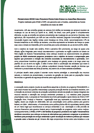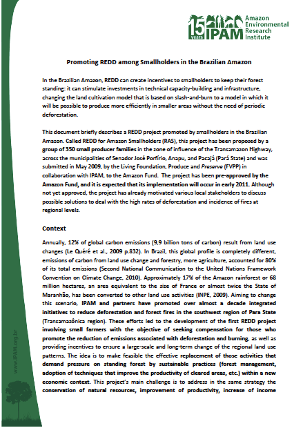 This document briefly describes a REDD project promoted by smallholders in the Brazilian Amazon that has been proposed by a group of 350 small producer families and submitted (and pre-approved), by the Living Foundation, Produce and Preserve (FVPP) in collaboration with IPAM, to the Amazon Fund.