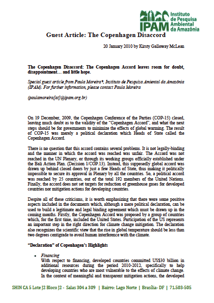 Este texto relata as atividades realizadas pelo Instituto de Pesquisa Ambiental da Amazônia (IPAM), durante a 15ª Conferência das Partes (COP15) da Convenção-Quadro das Nações Unidas sobre Mudança do Clima, ocorrida entre 7 e 19 de dezembro de 2009, em Copenhague, Dinamarca.