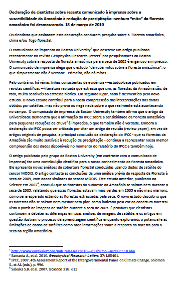 Documento assinado por cientistas que conduzem estudos sobre a floresta amazônica, clima e/ou fogo, sobre recente comunicado à imprensa da Universidade de Boston sobre a suscetibilidade da Amazônia à redução de precipitação. ALENCAR, A.; ASNER, G.; BRANDO, P.;...