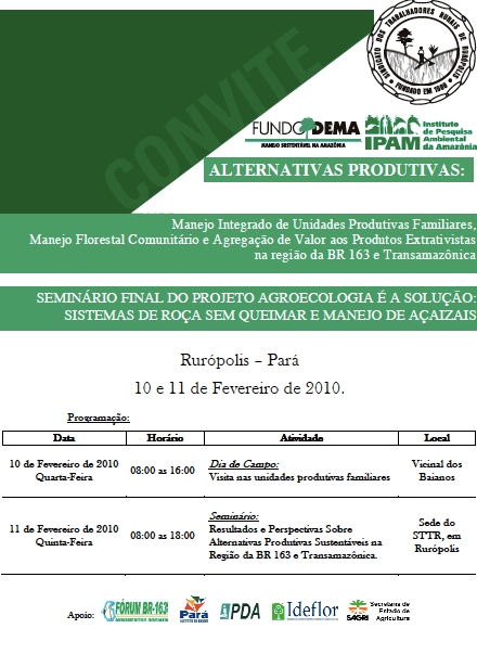 Convite: seminário final do projeto Agroecologia é a Solução: sistemas de roça sem queimar e manejo de açaizais