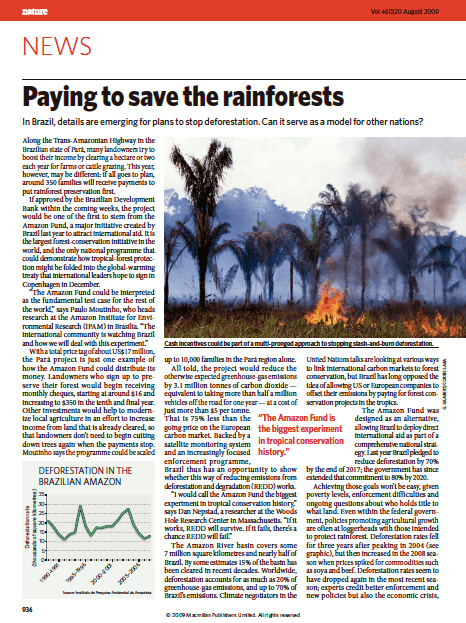 Reportagem publicada na revista Nature, em inglês, sobre projeto de pagamento por conservação da floresta, o Fundo Amazônia, ao longo da Transamazônica. Jeff Tollefson. Paying to save the rainforests. Revista Nature. Volume 460. 20 de agosto de...
