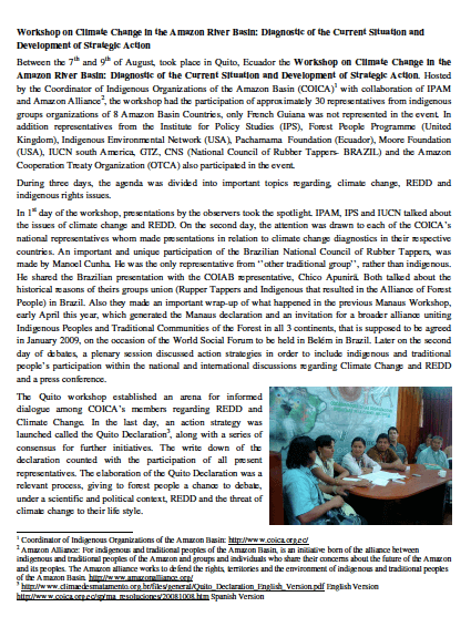 Resumo do workshop "Mudanças Climáticas na Bacia Amazônica: Diagnóstico da situação atual e desenvolvimento da ação estratégica", que teve lugar em Quito, no Equador. Esse documento está em inglês.