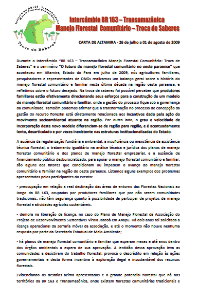 Documento final redigido por agricultores familiares, pesquisadores e representantes de ONGs, durante o "Intercâmbio BR 163 - Transamazônica Manejo Florestal Comunitário - Troca de Saberes" e o seminário “O futuro do manejo florestal comunitário no oeste paraense”, que aconteceu em Altamira, Estado do Pará, em julho de 2009.