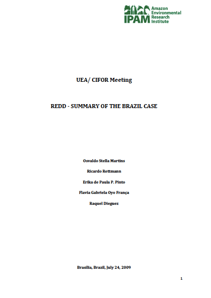 Documento apresenta, em inglês, o papel do Brasil no cenário global às alterações climáticas e apresenta iniciativas locais de curso de REDD. Martins, Osvaldo S.; Rettmann, Ricardo; Pinto, Erika; França, Flavia Gabriela; Dieguez, Raquel. REDD – The Case of Brazil....