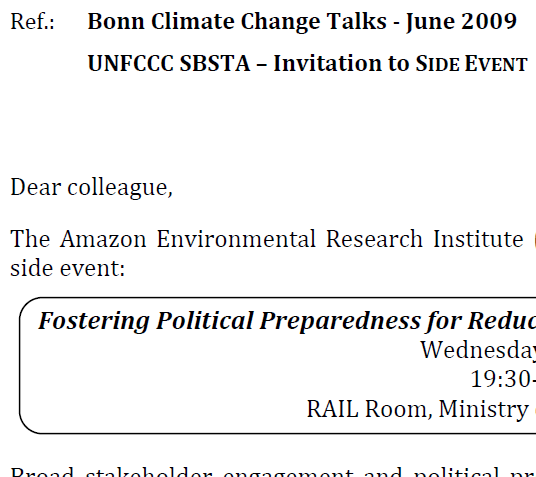 The invitation from the Amazon Environmental Research Institute - IPAM to the Side Event about the mechanism REDD.