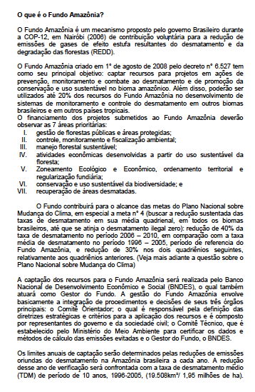 O Fundo Amazônia é um mecanismo proposto pelo governo brasileiro durante a COP-12, em Nairóbi (2006), de contribuição voluntária para a redução de emissões de gases de efeito estufa resultantes do desmatamento e da degradação das florestas (REDD). O Fundo Amazônia...