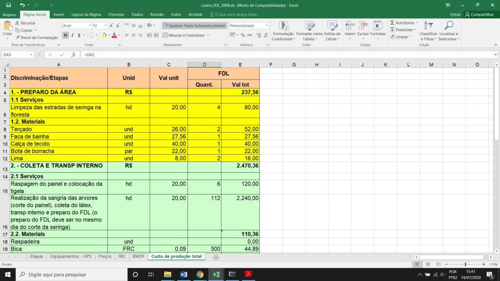 Tabela: Custo de produção de folha defumada líquida (FDL)