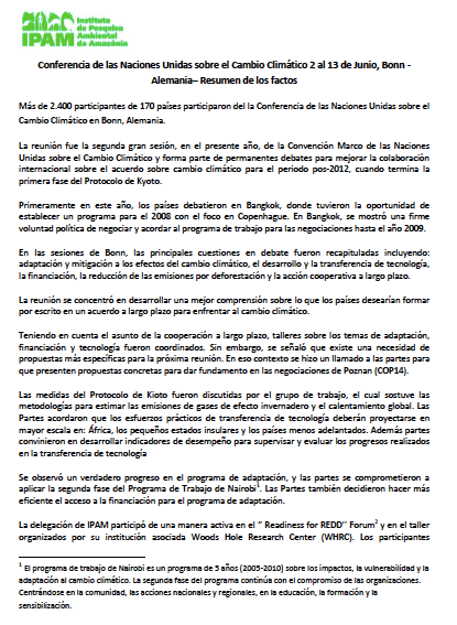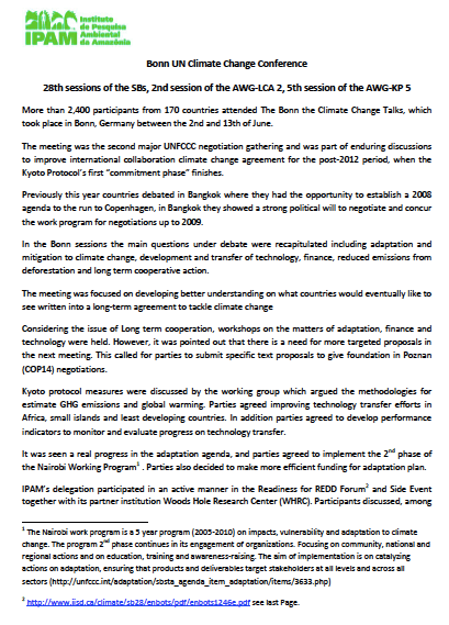 Summary of major topics of the Climate Change Conference, that was held in Bonn, Germany, in 2008. ENVIRONMENTAL RESEARCH INSTITUTE OF THE AMAZON - IPAM. Bonn UN Climate Change Conference. Bonn/Germany. June 13, 2008.