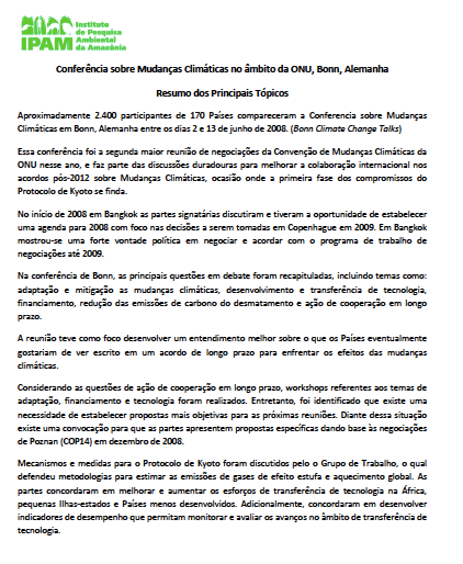 Resumo dos principais tópicos da Conferência das Nações Unidas sobre Mudanças Climáticas, que ocorreu em Bonn/Alemanha, em 2008.