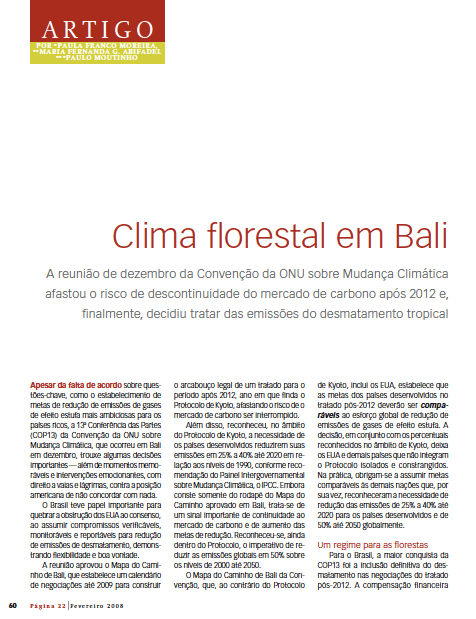 Artigo opinativo na revista Página 22 sobre a Conferência do Clima (COP13) em dezembro de 2007, que afastou o risco de descontinuidade do mercado de carbono após 2012 e, finalmente, decidiu tratar das emissões do desmatamento tropical. ABIFADEL, MARIA FERNANDA;...