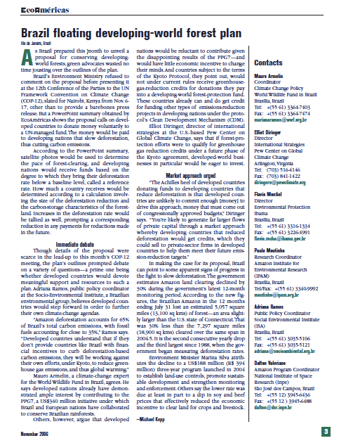 Reportagem divulgada em inglês para a revista EcoAméricas, cujo título traduzido é "Brasil flutuante plano global de desenvolvimento florestal". Report published in the EcoAméricas magazine.