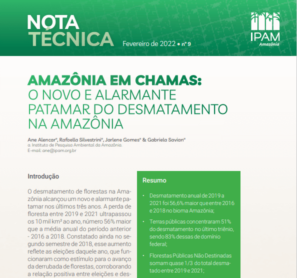 Desmatamento anual de 2019 a 2021 foi 56,6% maior que entre 2016 e 2018 na Amazônia; terras públicas concentraram 51% do desmatamento no último triênio, 83% dessas de domínio federal.