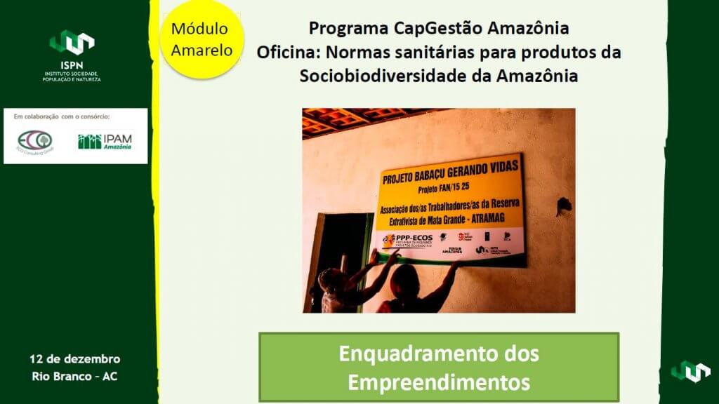 Esta apresentação, sobre normas sanitárias, faz parte do Módulo Amarelo, chamado Regularização Sanitária, um dos sete temas que compõem o Programa CapGestão Amazônia, realizado pelo Consórcio Eco Consult e IPAM.