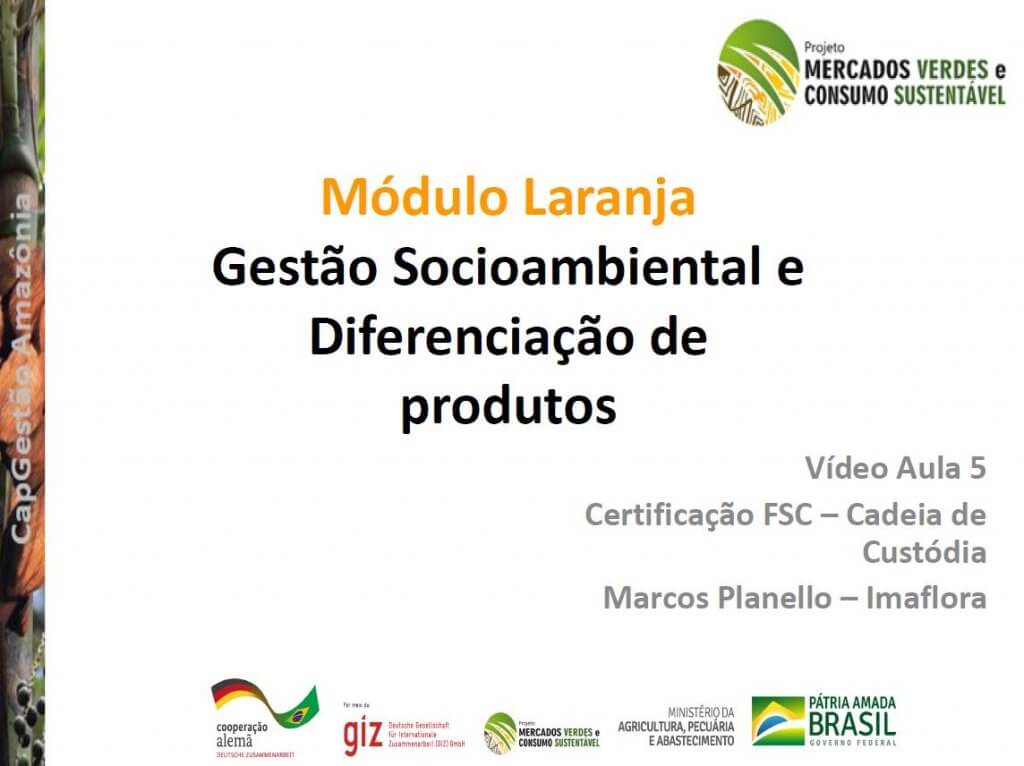 A apresentação, sobre certificação FSC e cadeia de custódia, faz parte de vídeo-aula 5 do Módulo Laranja, chamado Diferenciação de Mercado, um dos sete temas que compõem o Programa CapGestão Amazônia, realizado pelo Consórcio Eco Consult e IPAM. É parte do projeto...