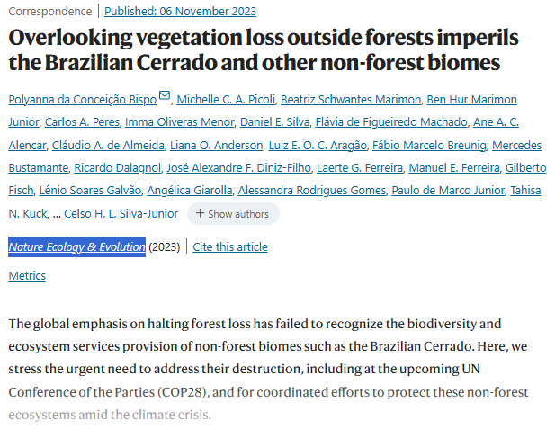 The global emphasis on halting forest loss has failed to recognize the biodiversity and ecosystem services provision of non-forest biomes such as the Brazilian Cerrado. Here, we stress the urgent need to address their destruction, including at the upcoming UN...