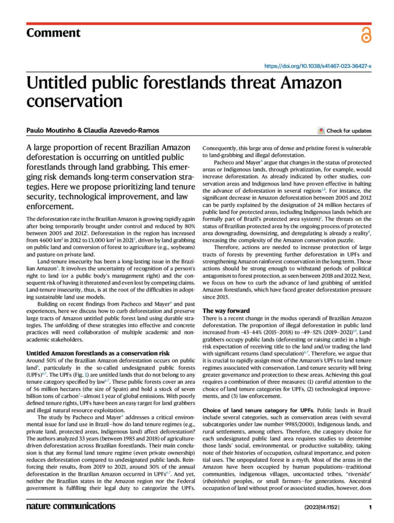 A large proportion of recent Brazilian Amazon deforestation is occurring on untitled public forestlands through land grabbing. This emerging risk demands long-term conservation strategies. Here we propose prioritizing land tenure security, technological...