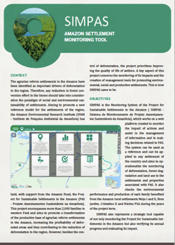 The system can be used as a reference and can be applied to any settlement of the country and aims to operationalize the monitoring of deforestation, forest degradation and land use in the settlements and properties associated with PAS.