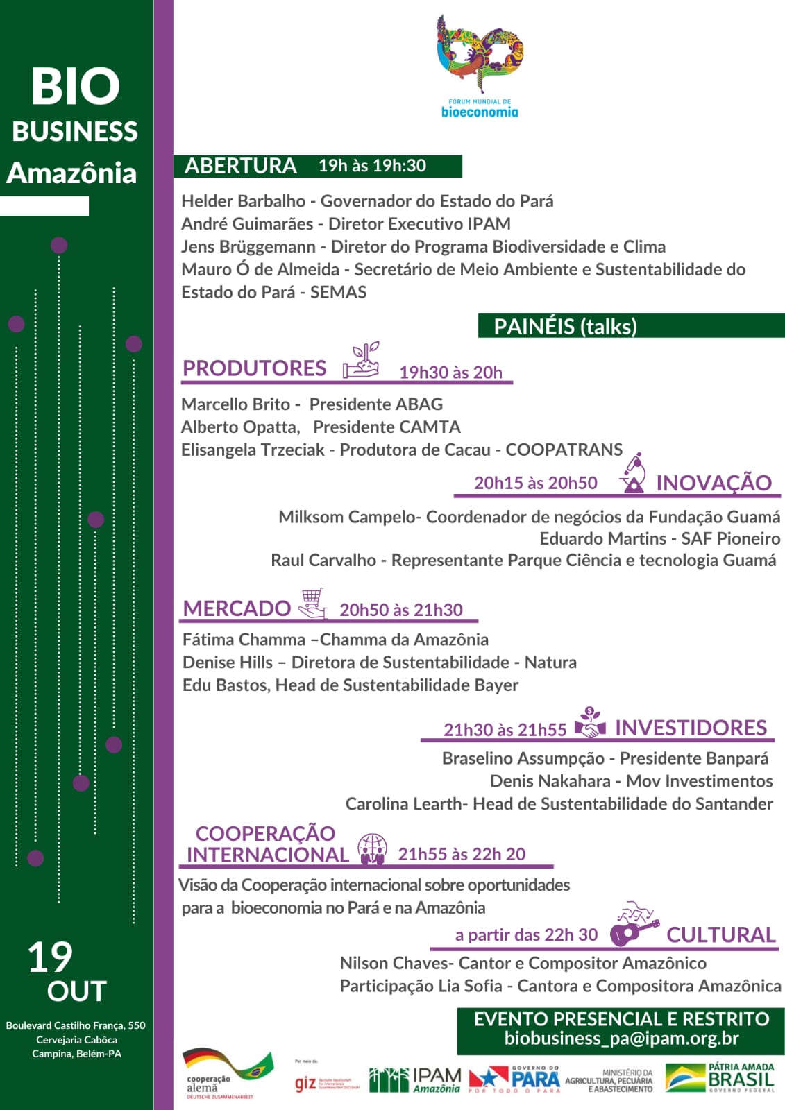 Ao final, haverá um momento cultural com apresentação do cantor e compositor amazônico Nilson Chaves, e participação especial da também cantora e compositora amazônica Lia Sofia.