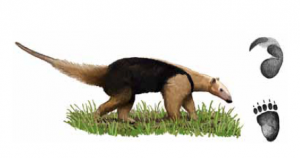 Animal de grande porte, chega a pesar 60 kg e seu corpo alcançar 1,20 m, além da cauda de quase 1 m, resultando em 2,20 m o seu comprimento final. Suas patas dianteiras possuem garras muito desenvolvidas que são utilizadas para destruir cupinzeiros. O tamanduá-bandeira pode ser encontrado em florestas, campos abertos e cerrados, onde alimenta-se de formigas, cupins e larvas. Sua pegada dianteira é marcada por um círculo em forma de foice (garra) com cerca de 8 cm de diâmetro. A pegada traseira é semelhante ao de uma criança, com dedos bem definidos e seguidos de marcas das unhas, com 10 cm de comprimento e entre 6 a 7 cm de largura.