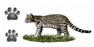 A jaguatirica é uma espécie de médio porte com aproximadamente 80 cm de comprimento, pesando em torno de 11 kg. Animal solitário, vive principalmente em áreas de florestas. Possui hábitos noturnos e alimenta-se de pequenos roedores. Sua pegada apresenta almofada arredondada e quatro dedos sem as marcas das unhas, com comprimento variando de 4 a 5 cm e a largura de 4,5 a 5,5 cm. A pegada dianteira deste animal é maior que a traseira, assemelhando-se muito às marcas da onça-pintada, porém em tamanho reduzido.