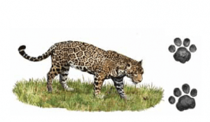A onça-pintada é o maior felino das Américas, medindo até 1,80 m de comprimento e pesando mais de 100 kg. Animal de hábitos solitários, é ativo durante o dia e a noite. Habita áreas de vegetação densa e com abundância de água, onde pode encontrar facilmente suas presas. Sua alimentação inclui uma grande variedade de animais de médio e grande portes. As pegadas da onça-pintada são grandes e bem marcantes. A dianteira, que mede de 10 a 12 cm de comprimento e 10 a 13 cm de largura, é maior que a pegada traseira (9 a 11 cm de comprimento e 9 a 10 cm de largura), com almofada grande e arredondada. Os dedos são arredondados e sem marcas das unhas.