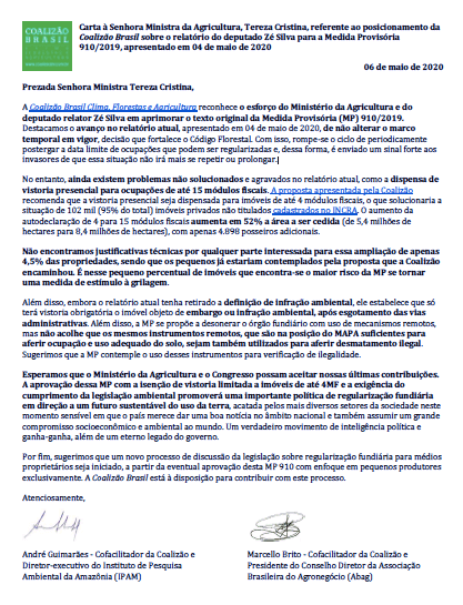 Carta à Senhora Ministra da Agricultura, Tereza Cristina, referente ao posicionamento da Coalizão Brasil sobre o relatório do deputado Zé Silva para a Medida Provisória 910/2019, apresentado em 4 de maio de 2020.