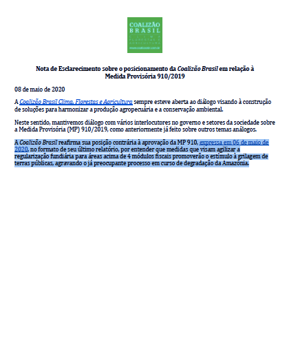 A Coalizão Brasil Clima, Florestas e Agricultura reafirma sua posição contrária à aprovação da MP 910, expressa em 06 de maio de 2020, no formato de seu último relatório, por entender que medidas que visam agilizar a regularização fundiária para áreas acima de 4...
