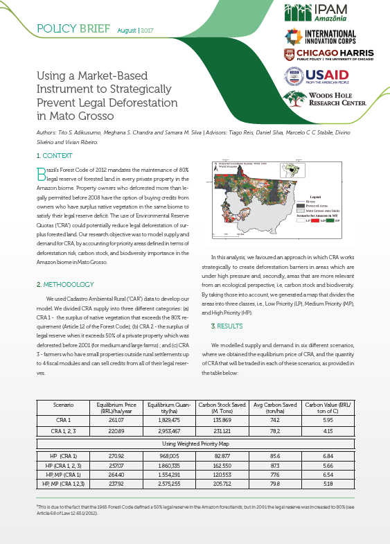 The research objective of this study was to model supply and demand for CRA, by accounting for priority areas defi ned in terms of deforestation risk, carbon stock, and biodiversity importance in the Amazon biome in Mato Grosso.