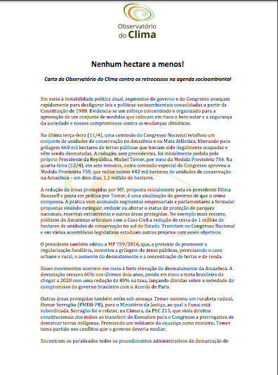 O Observatório do Clima, do qual o IPAM faz parte, reunido em assembleia em Atalanta (SC), lançou na noite de quarta-feira (12) uma carta em protesto contra o ataque coordenado em Brasília à proteção ambiental e aos direitos dos povos tradicionais.