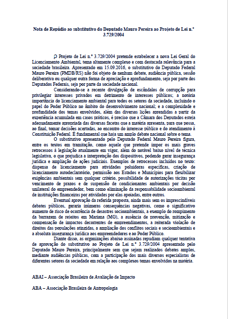 Organizações da sociedade civil divulgam uma nota de repúdio contra a votação no Congresso do substitutivo ao projeto de lei no 3.729/2004, que estabelece uma nova Lei Geral do Licenciamento Ambiental sem nenhum debate, audiência pública, sessão deliberativa ou qualquer outra forma de apreciação e aprofundamento, seja por parte dos deputados federais, seja por parte da sociedade nacional.