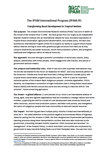 IPAM IP was born with important international roles. We are the Secretariat for the Forum on Readiness for REDD. Our dream—a global alliance: A core element of our vision is an international alliance of strong, agile, local and regional organizations that are imbedded in strategic nations and forest frontiers.