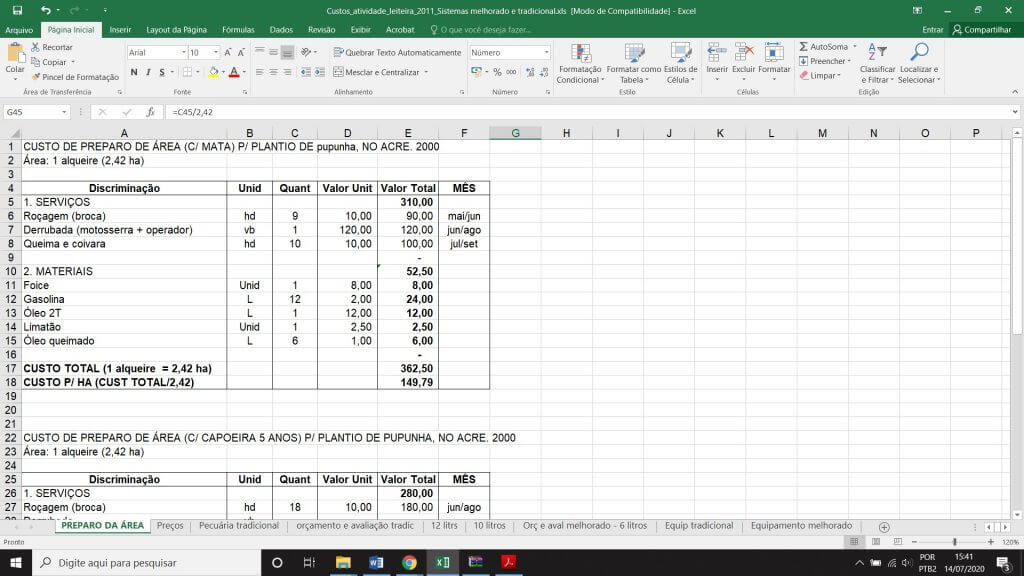 Planilha aberta de custos de produção de atividade leiteira - sistemas tradicional e melhorado. O conteúdo faz parte do Módulo Azul, chamado "Análise de Cadeias de Valor", um dos sete temas abordados pelo Programa CapGestão Amazônia.