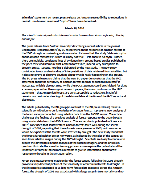 Statement signed by scientists who conduct research on Amazon forests, climate, and/or fire on recent press release on Amazon susceptibility to reductions in rainfall.
