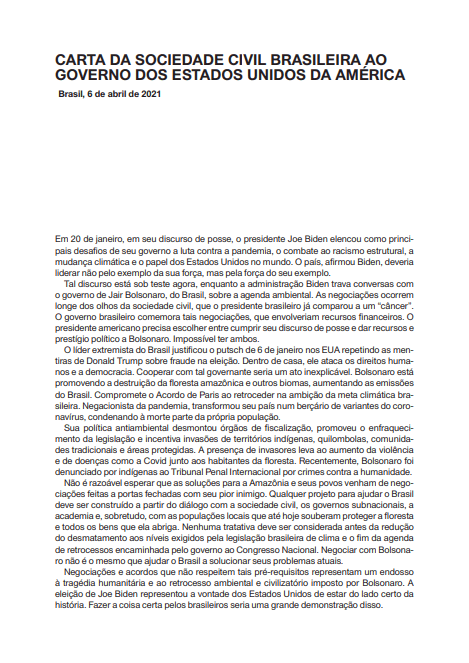 Em carta, quase 200 organizações brasileiras alertam presidente americano sobre risco de negociação a portas fechadas com o Brasil.