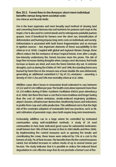 Fire is the least expensive and most broadly used method of clearing land and converting forest biomass into soil nutrients for pastures and crops in the tropics. Fire is also used to control weeds and to reinvigorate palatable pasture grasses. Even if beneficial for farmers over the short run, intensification of deforestation and burning impose long-term costs on individuals and society.