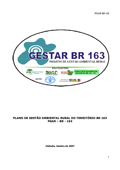 O relatório oferece informações sobre o processo e os resultados obtidos na elaboração do Plano de Gestão Ambiental Rural do território da BR 163. A iniciativa decorre das ações desenvolvidas pelo projeto GESTAR BR 163 / PA, no estado do Pará, de acordo com a proposta assinada pela “Fundação Viver Produzir e Preservar -FVPP e seus co-participante com o projeto FAO/TCP/BRA/2903 e UTF/BRA/060/BRA através do Ministério do Meio Ambiente -MMA Secretaria De Políticas para o Desenvolvimento Sustentável – SDS, Departamento de Gestão Ambiental e Territorial.