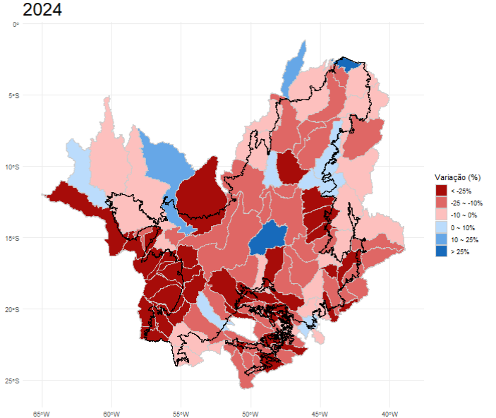 Variação na superfície de água natural nas bacias hidrográficas do Cerrado entre 1985-2024 (Fonte: MapBiomas Água)