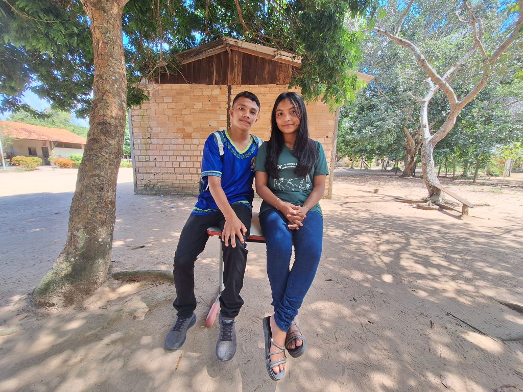 “A gente tirou foto lá tudinho. Estava tudo plantado, bonito já o cacaueiro. Só que a gente teve que voltar depois, outro dia, e já tinha começado a pegar fogo. As árvores no caminho, na beira da estrada, estavam todas pegando fogo, só que não era um fogo muito alto ainda. A gente viu um bocado de fumaça que vinha de dentro do mato. Nessa hora, a vimos uns porcos fugindo também”, conta Sophia, durante conversa em frente à sua escola em Jauarituba.