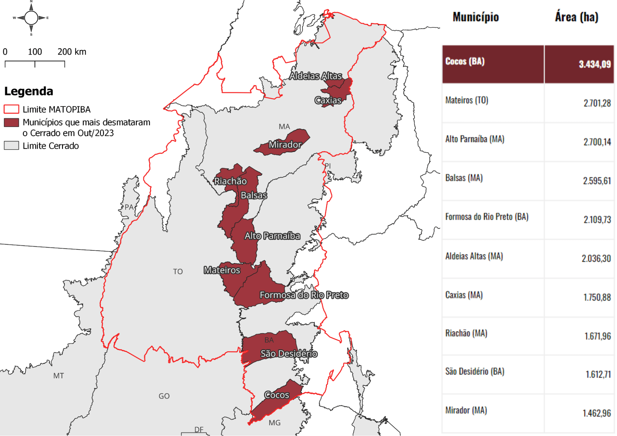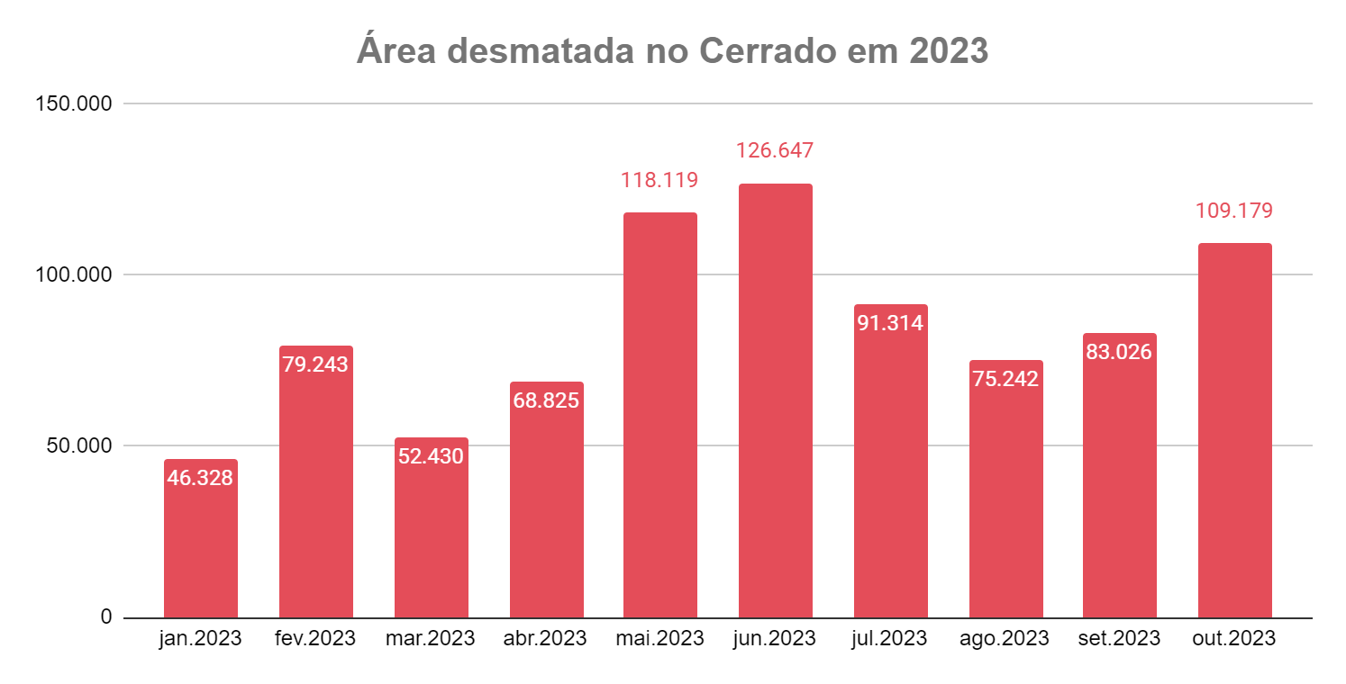 No Maranhão, foram desmatados 42,5 mil hectares de vegetação nativa, um aumento de 148% em relação a outubro do ano passado. No Tocantins, o segundo estado que mais desmatou em outubro de 2023, o aumento foi de 185%, chegando a 23,5 mil hectares. O Cerrado baiano, por sua vez, perdeu 10,6 mil hectares em outubro, 148% a mais do que em 2022. O Piauí registrou 10,9 mil hectares desmatados, aumentando 80% do seu desmatamento em relação ao mesmo período do ano passado.