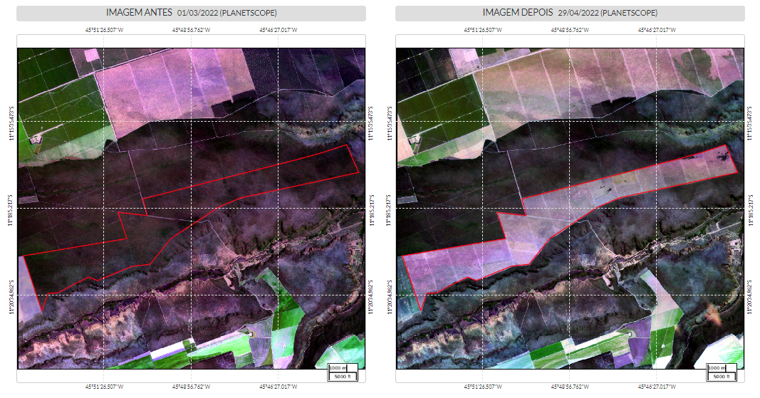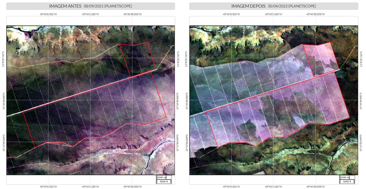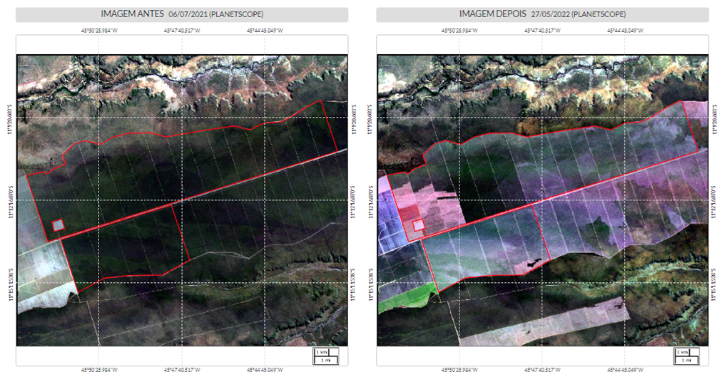 Na Fazenda Estrondo, condomínio de propriedades rurais localizado no município baiano de  Formosa do Rio Preto, o MapBiomas Alerta identificou a maior área desmatada do país em 2022, composta por três polígonos com cerca de 23 mil hectares. A vegetação nativa perdida estava inserida na APA (Área de Proteção Ambiental) do Rio Preto e sua supressão contou com a autorização do Inema (Instituto do Meio Ambiente e Recursos Hídricos) da Bahia.