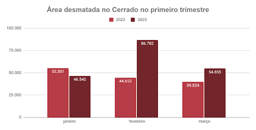 O desmatamento no Cerrado chegou a 188,2 mil hectares no primeiro trimestre deste ano. Esse número representa 35% a mais do que o registrado nos três primeiros meses do ano anterior, quando foram desmatados 139,8 mil hectares, segundo dados do SAD Cerrado (Sistema de Alerta de Desmatamento do Cerrado) divulgados nesta sexta-feira. Apesar do aumento no primeiro trimestre, o registro de alertas de desmatamento para o mês de março diminuiu em relação a fevereiro desde ano (redução de 31,9 mil hectares).
