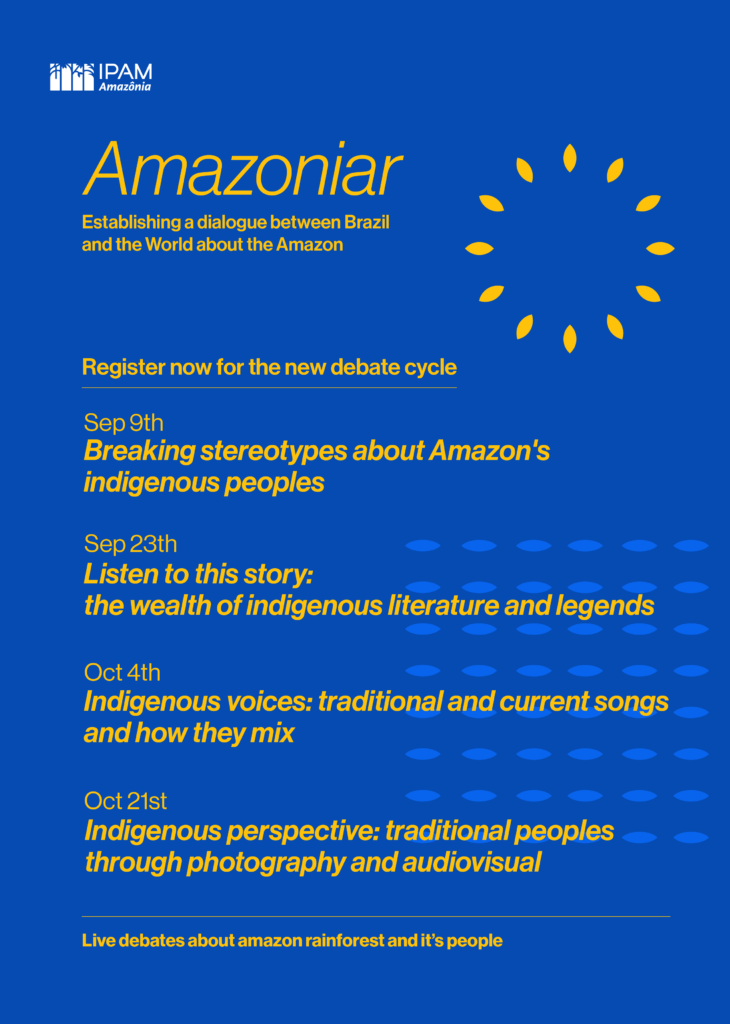 In September, the Amazon Environmental Research Institute (IPAM) will launch the third cycle of Amazoniar, a project that aims to promote a global dialogue on the Amazon forest and its influence on relations between Brazil and the world. There will be four webinars between September and October this year, under the theme ‘Culture and art of the Amazon indigenous peoples as a form of resistance’.