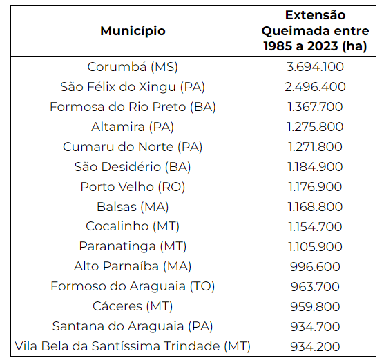Municípios com maior área queimada no Brasil entre 1985 a 2023.