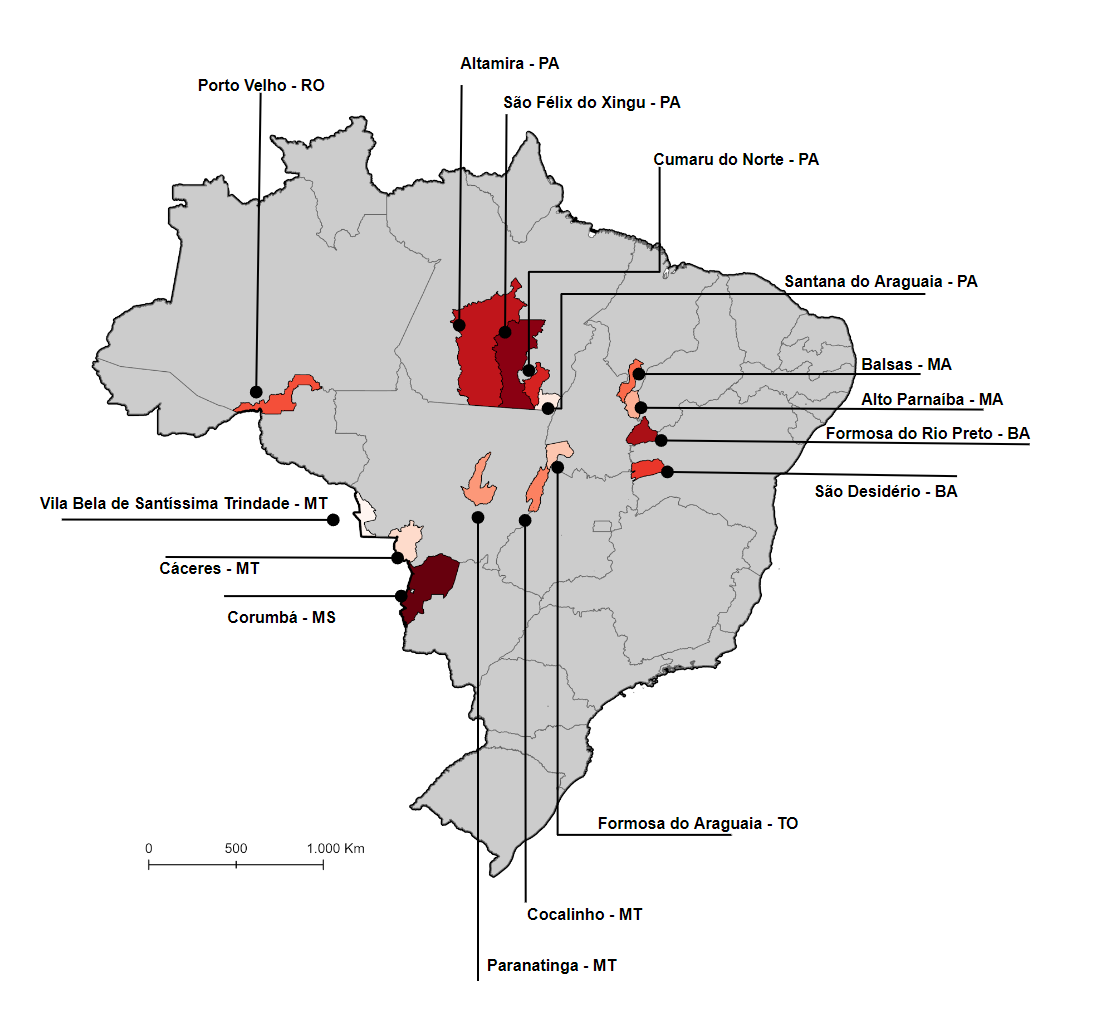 Mato Grosso, com 43,6 milhões de hectares; Pará, com 28,4 milhões de hectares; e Maranhão, 20 milhões de hectares, foram os líderes de área queimada desde 1985: 46% de tudo que queimou estava localizado nos três Estados, cerca de 92 milhões de hectares. Dentre os municípios, Corumbá (MS), São Félix do Xingu (PA) e Formosa do Rio Preto (BA) foram os maiores registros de área queimada, totalizando 7,5 milhões de hectares nos últimos 39 anos. Juntos, os 10 municípios que mais desmataram, dos quais cinco estão no Cerrado, quatro na Amazônia e um no Pantanal, responderam por 8% de toda a área queimada do Brasil nos últimos 39 anos.