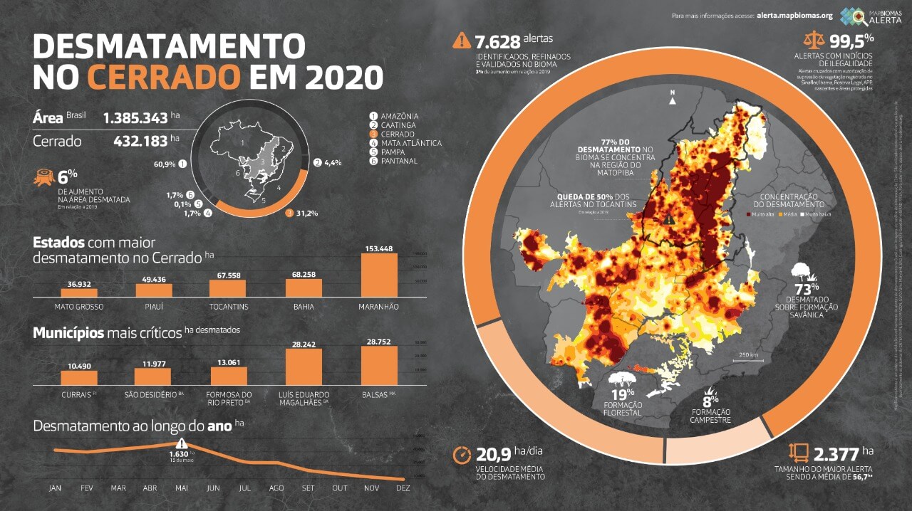 O relatório também apresenta um inédito cálculo da velocidade do desmatamento: pela primeira vez foi possível estimar quanto o Brasil perdeu de cobertura vegetal nativa a cada dia de 2020: foram 3.795 hectares desmatados em média, o que dá uma perda de 24 árvores a cada segundo durante todo o ano. No dia mais crítico de desmatamento, 31 de julho, foram desmatados 4.968 hectares, quase 575 m2 por segundo.