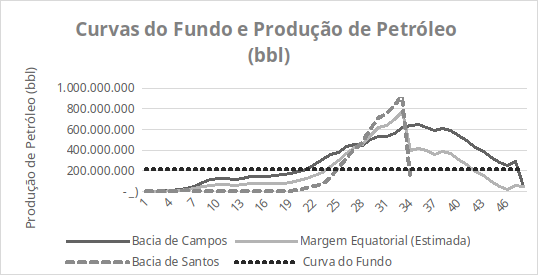 Curvas de produção petroleira, em barris por ano ao longo do tempo, e curva de rendimento equivalente do Fundo de Royalties Verdes (Fonte: IPAM)