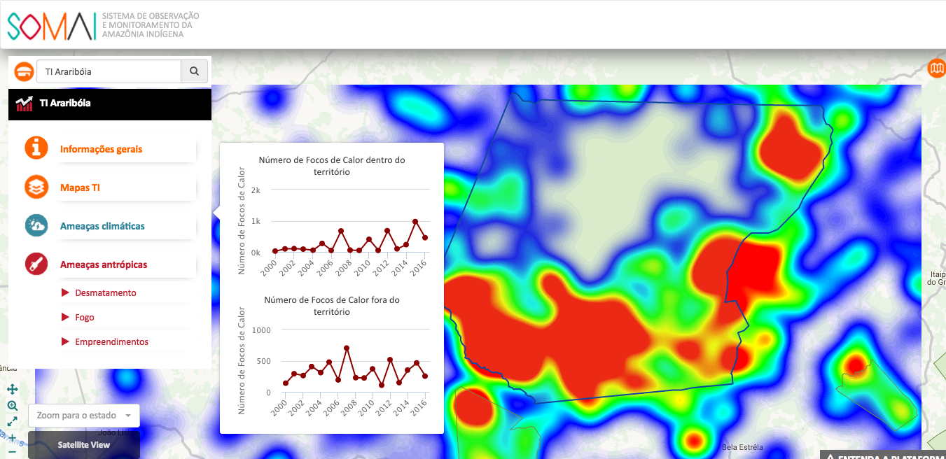 Mapa do calor na TI Arariboia em 2015 e gráfico de focos de calor, com pico em 2016. Fonte: SOMAI (www.somai.org.br).